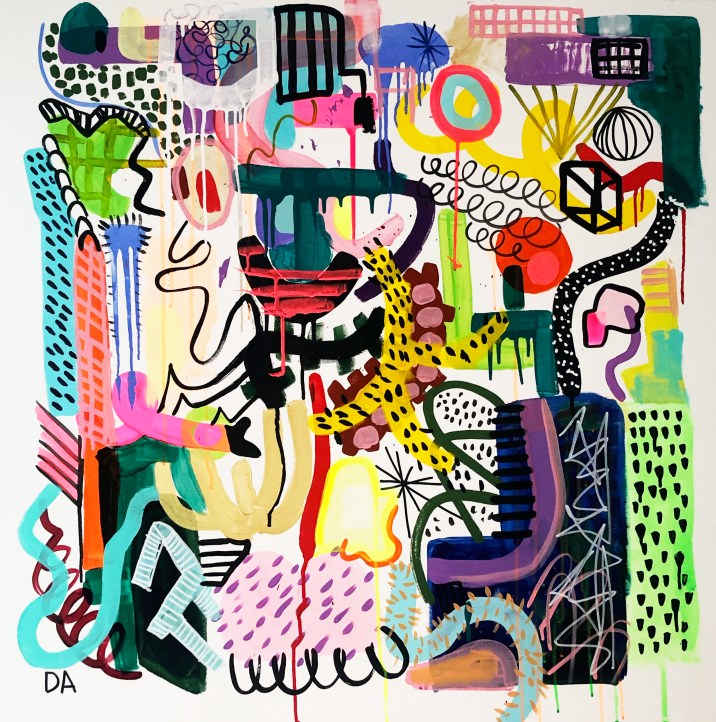 Her work delights with thick textures, vibrant colors and graphic patterns.